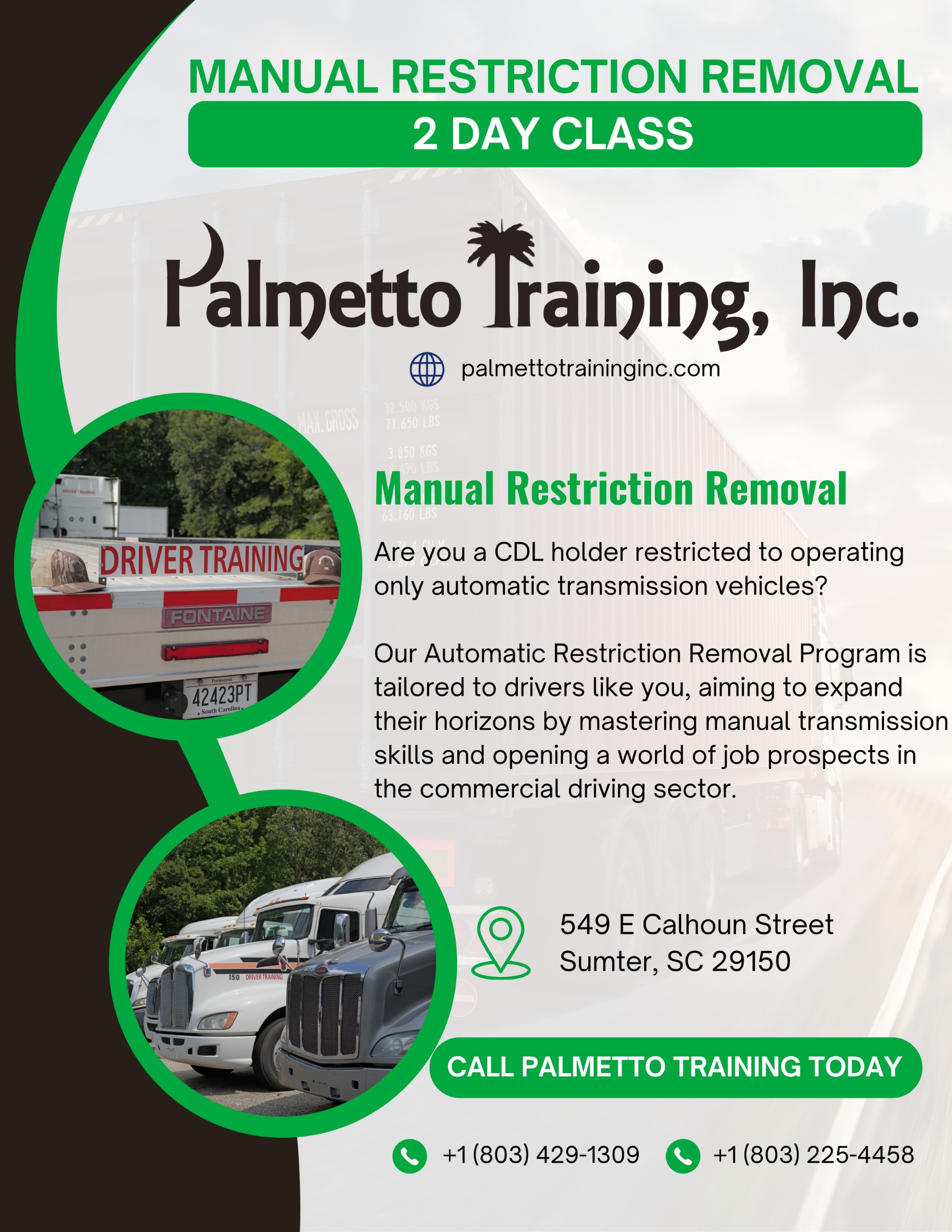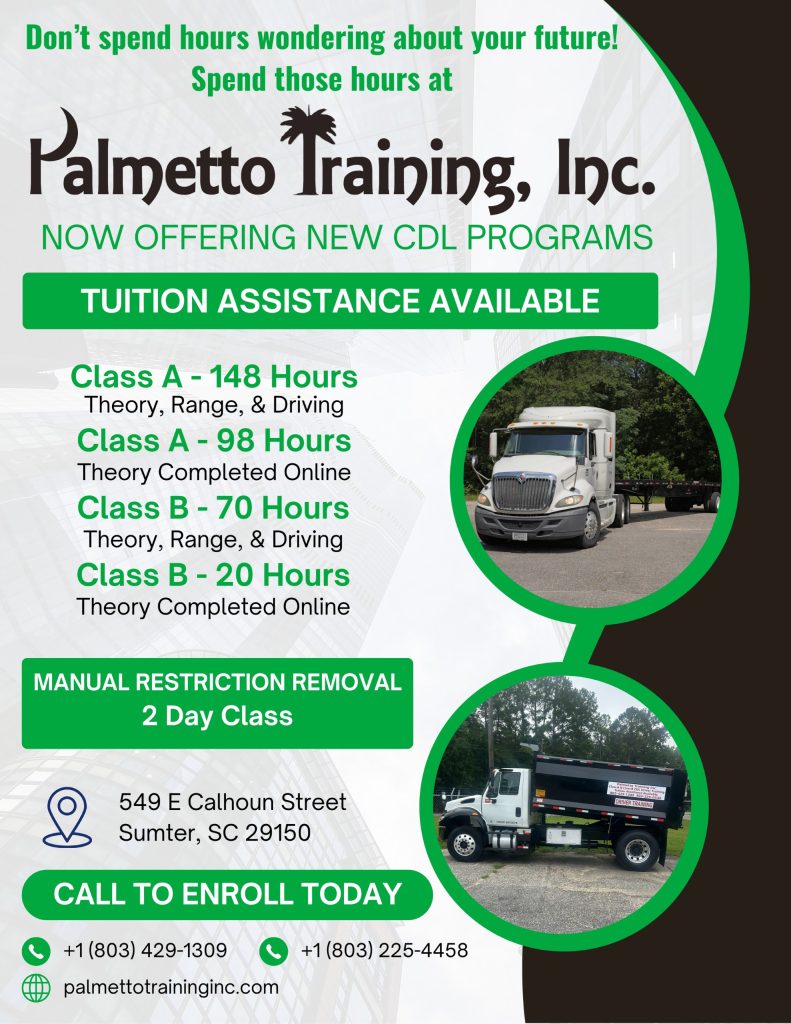 Palmetto Training, Inc. helped me remove my manual restriction on my CDL and I couldn’t be happier. Thank you PTI.